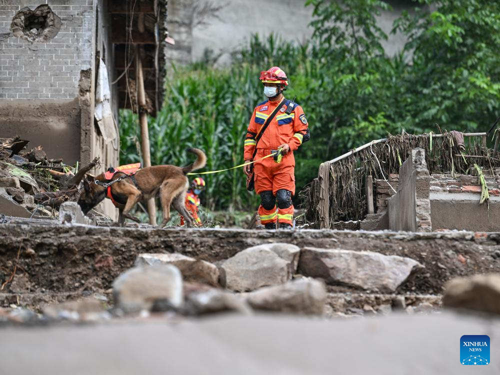 E-mail Xinhua, July 22, 2024A rescuer works with a sniff dog at Xinhua Village, Malie Township, Hanyuan County, Ya'an City, southwest China's Sichuan Province, July 21, 2024. Rescuers have retrieved eight bodies, found and brought four to safety as of 8 p.m. Saturday, after rain-triggered flash floods in southwest China's Sichuan Province left over 30 missing.(Xinhua/Wang Xi)