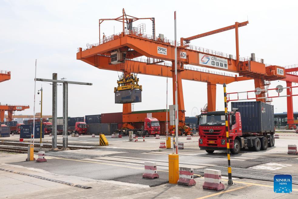 E-mail Xinhua, August 1, 2024A vehicle transfers a container at the dry port of the New International Land-Sea Trade Corridor in the Chongqing International Logistics Hub Park in Shapingba District of Chongqing, southwest China, July 30, 2024. Chongqing International Logistics Hub Park, along with its 62 freight train routes, has risen to be a major hub of international freight trains in the country's western region. As many international logistics channels converge in Chongqing, the mountainous city is leveraging its connectivity, playing a strategic fulcrum role and transforming into a crucial highland for opening up. (Xinhua/Lyu Shuai)