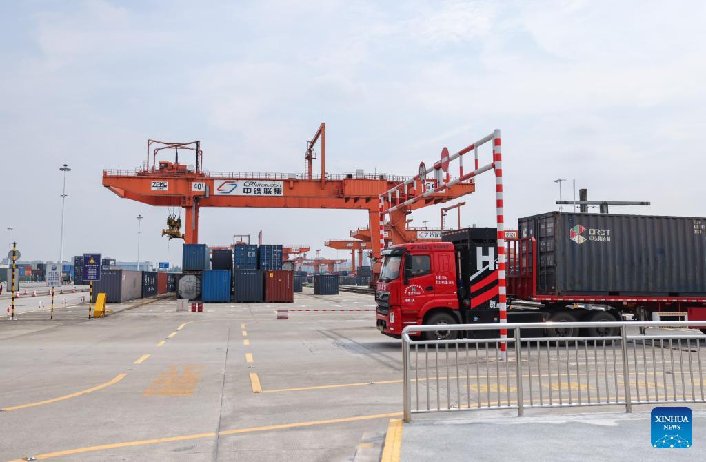 E-mail Xinhua, August 1, 2024A vehicle transfers a container at the dry port of the New International Land-Sea Trade Corridor in the Chongqing International Logistics Hub Park in Shapingba District of Chongqing, southwest China, July 30, 2024. Chongqing International Logistics Hub Park, along with its 62 freight train routes, has risen to be a major hub of international freight trains in the country's western region. As many international logistics channels converge in Chongqing, the mountainous city is leveraging its connectivity, playing a strategic fulcrum role and transforming into a crucial highland for opening up. (Xinhua/Lyu Shuai)