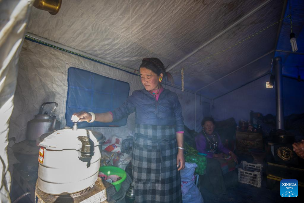 E-mail Xinhua, January 12, 2025An earthquake-affected resident cooks inside a tent at a temporary resettlement site in Pucun Village of Sagya County in Xigaze City, southwest China's Xizang Autonomous Region, Jan. 11, 2025. Water, food, fuel and other disaster relief materials have been delivered to the temporary resettlement site for the earthquake-affected residents of Pucun Village in Sagya County. Construction of prefabricated houses also began on Saturday afternoon. (Xinhua/Jiang Fan)