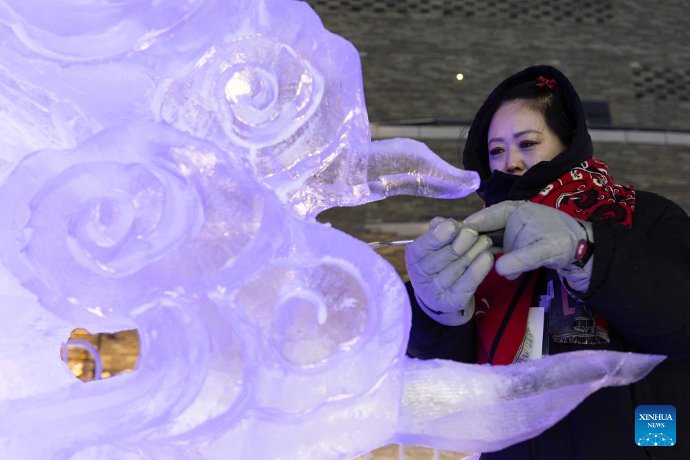 A competitor works on an ice sculpture during the first edition of Heilongjiang Ice Carving Vocational Skills Competition at the Harbin Ice-Snow World in Harbin, northeast China's Heilongjiang Province, Jan. 15, 2025. The competition kicked off on Wednesday, attracting more than 50 skilled professionals from 18 teams. (Xinhua/Zhang Tao)
