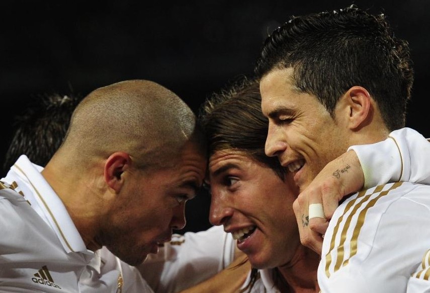 Real Madrid's Portuguese forward Cristiano Ronaldo (R) celebrates with Real Madrid's Portuguese defender Pepe (L) and Real Madrid's defender Sergio Ramos (C) after scoring during the Spanish League "El clasico" football match Barcelona vs Real Madrid at the Camp Nou stadium in Barcelona on April 21, 2012. Real Madrid won 2-1. [Xinhua/AFP Photo]