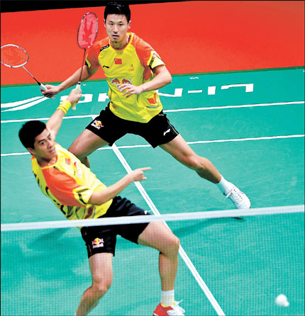 China's Cai Yun (back) and Fu Haifeng in action against Rian Agung Saputro and Angga Pratama (inset) of Indonesia during their men's doubles tie of their Sudirman Cup quarterfinals yesterday. |