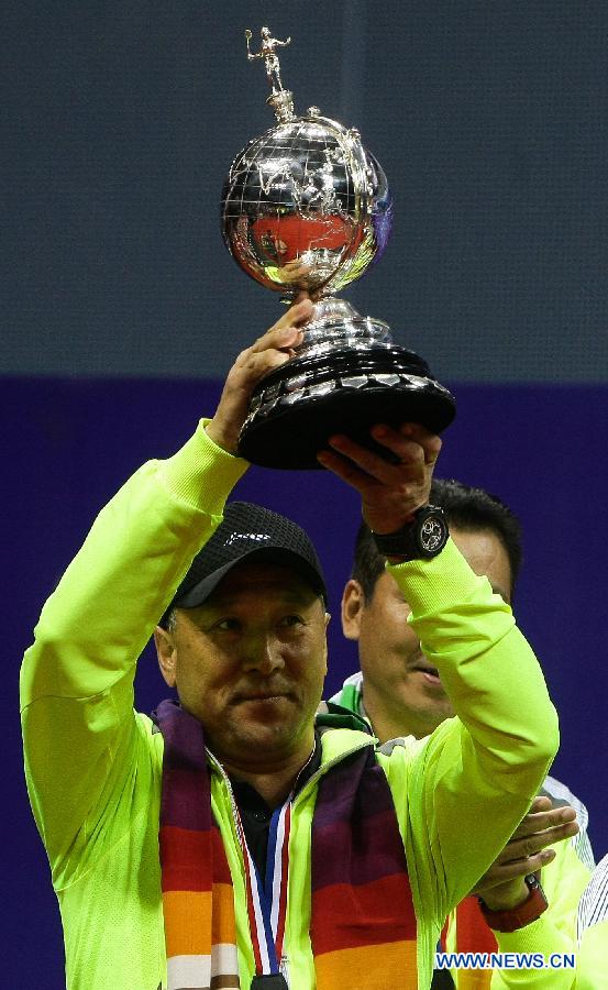 China's head coach Li Yongbo celebrates with trophy during the awarding ceremony for the Uber Cup badminton championship in New Delhi, capital of India, May 24, 2014. China claimed the title of the event by beating Japan in the final 3-1. (Xinhua/Zheng Huansong) |