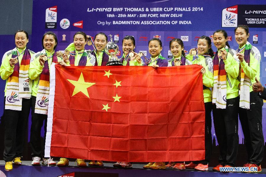 Chinese players celebrate during the awarding ceremony for the Uber Cup badminton championship in New Delhi, capital of India, May 24, 2014. China claimed the title of the event by beating Japan in the final 3-1. (Xinhua/Zheng Huansong)
