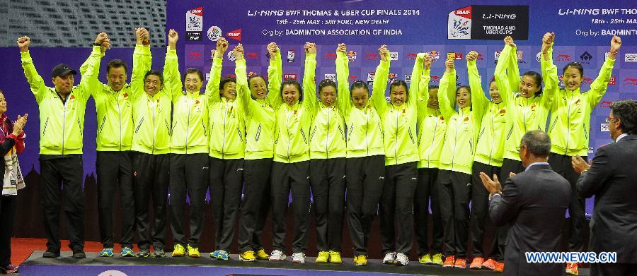Chinese women's team attend the awarding ceremony for the Uber Cup badminton championship in New Delhi, capital of India, May 24, 2014. China claimed the title of the event by beating Japan in the final 3-1. (Xinhua/Zheng Huansong)