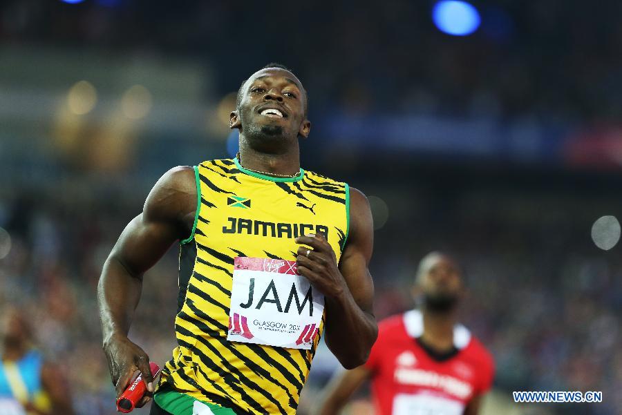 Usain Bolt of Jamaica reacts after the men's 4X100m relay final of Athletics at the 2014 Glasgow Commonwealth Games in Hampden Park in Glasgow, Scotland on Aug. 2, 2014. Jamaica won the gold medal with a time of 37.58 seconds. [Photo: Xinhua/Han Yan] |