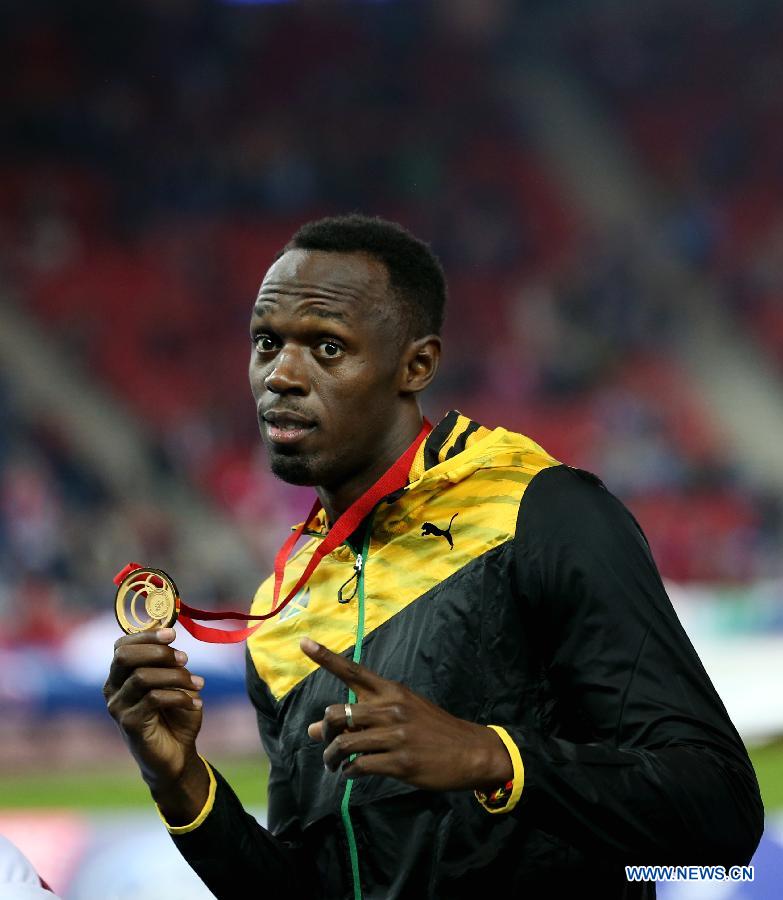 Usain Bolt of Jamaica reacts during the awarding ceremony for the men's 4X100m relay final of Athletics at the 2014 Glasgow Commonwealth Games in Hampden Park in Glasgow, Scotland on Aug. 2, 2014. Jamaica won the gold medal with a time of 37.58 seconds. [Photo: Xinhua/Han Yan]