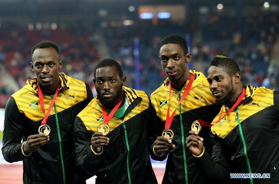 Athletes of Jamaica react during the awarding ceremony for the men's 4X100m relay final of Athletics at the 2014 Glasgow Commonwealth Games in Hampden Park in Glasgow, Scotland on Aug. 2, 2014. Jamaica won the gold medal with a time of 37.58 seconds. [Photo: Xinhua/Han Yan] |