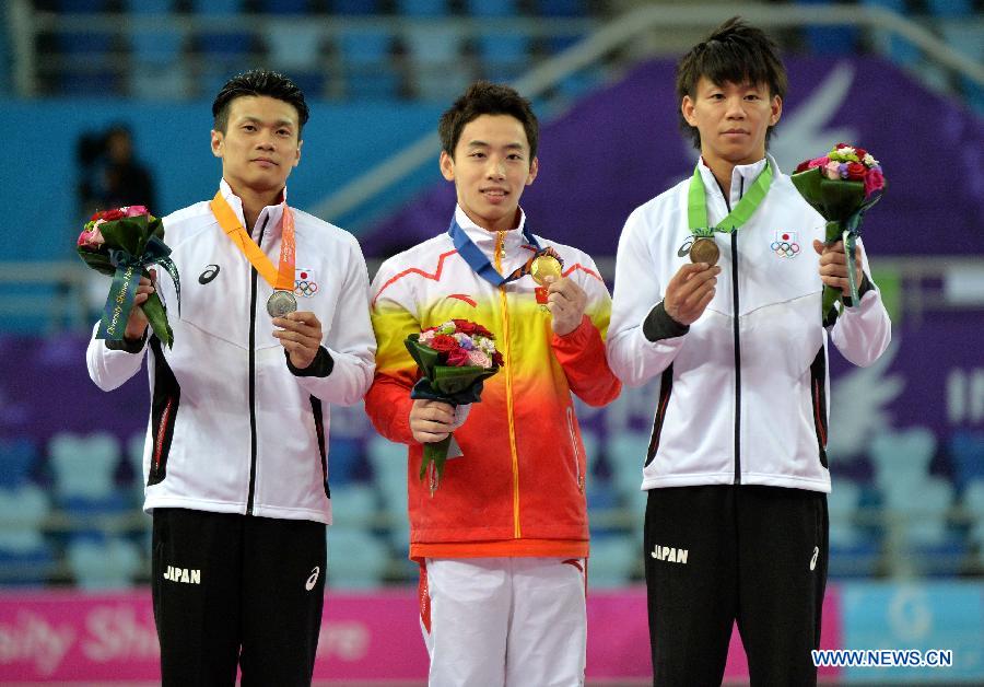 Gold medalist Zou Kai (C) of China, silver medalist Saito Yusuke (L) of Japan and bronze medalist Yamamoto Masayoshi of Japan pose during the awarding ceremony of the men's horizontal bar contest of gymnastics artistic event at the 17th Asian Games in Incheon, South Korea, Sept. 25, 2014. Zou Kai won the gold medal with 15.800 points. (Xinhua/Zhu Zheng) |