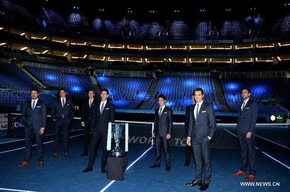 | All players for the singles events Stan Wawrinka of Switzerland, Milos Raonic of Canada, Tomas Berdych of Czech Republic, Novak Djokovic of Serbia, Kei Nishikori of Japan, Andy Murray of Britain, Roger Federer of Switzerland and Marin Cilic of Croatia (From L to R) pose for an official group photo prior to the Barclays ATP World Tour Finals at the O2 Arena in London, Britain, on Nov. 7, 2014. [Xinhua] |