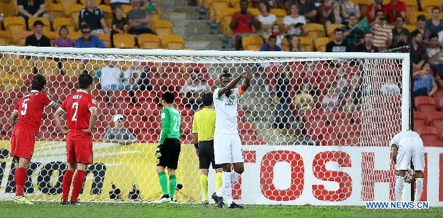 Picture taken on Jan. 10, 2015 shows Wang Dalei (L4) of China talked to ball boy Stephen White (L3) during the Group B match against Saudi Arabia at the AFC Asian Cup in Brisbane, Australia. Stephen White was invited to watch the training of Chinese football team on Jan. 12, 2015. During the Group B match against Saudi Arabia on Jan. 10, 2015, Wang talked to Stephen White before he saved the penalty shot. White advised Wang Dalei to dive left and Wang listened and save the penalty shot successfully, which helped the Chinese team to a 1-0 victory. [Photo/Xinhua]
