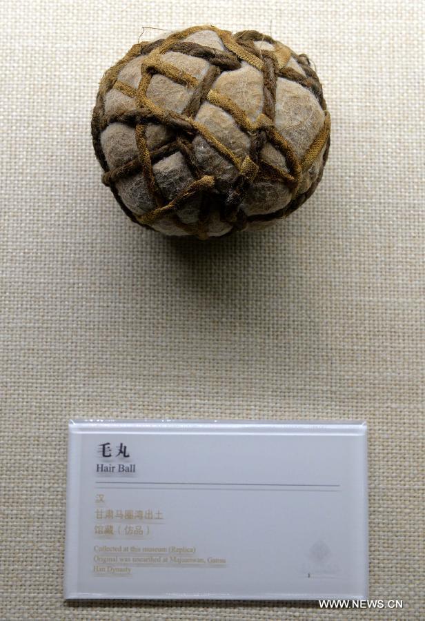| Photo taken on Oct. 23, 2015 shows the model of Hair Ball at Linzi Football Museum in east China's Shandong Province. China's Linzi Football Museum announced a partnership with the National Football Museum in Manchester, England on Friday. The two museums would work together to promote their shared objectives of communicating football culture to a world-wide audience. Linzi district, the birth place of Cuju, has been officially recognized by FIFA in 2004 as the origin of football. [Zhu Zheng/Xinhua] |