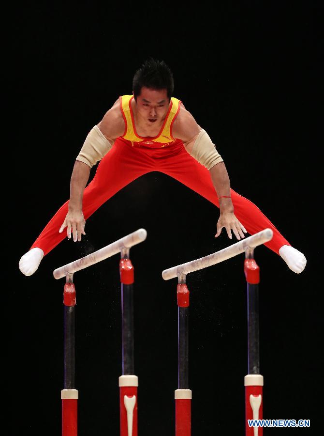 You Hao of China competes during the men's parallel bars final at the 46th World Artistic Gymnastics Championships in Glasgow, Britain, Nov. 1, 2015. You Hao won the gold medal with a score of 16.216 points. (Xinhua/Han Yan) |