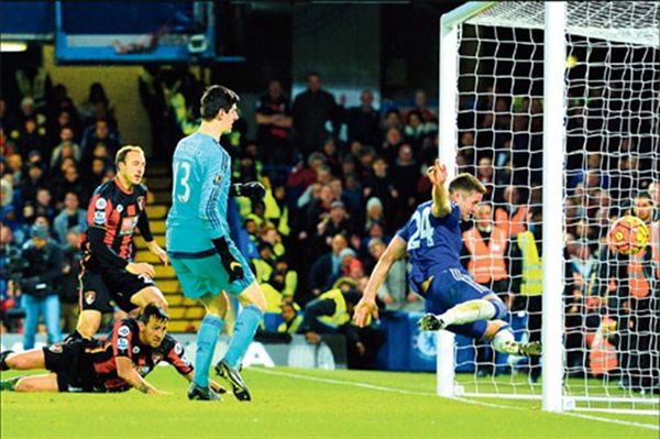Bournemouth striker Glenn Murray (left) scores the game's only goal past Chelsea defender Gary Cahill during their English Premier League match at Stamford Bridge in London on Saturday. |