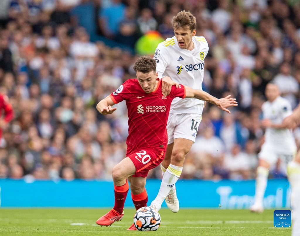 Liverpool's Diogo Jota (L) is pulled back by Leeds United's Diego Llorente during the Premier League football match between Leeds United and Liverpool in Leeds, Britain, on Sept. 12, 2021. (Xinhua)