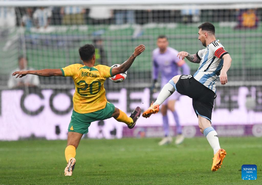 Lionel Messi (R) of Argentina vies with Keanu Baccus of Australia during an international football invitational between Argentina and Australia in Beijing, capital of China, June 15, 2023. (Xinhua/Xie Han)