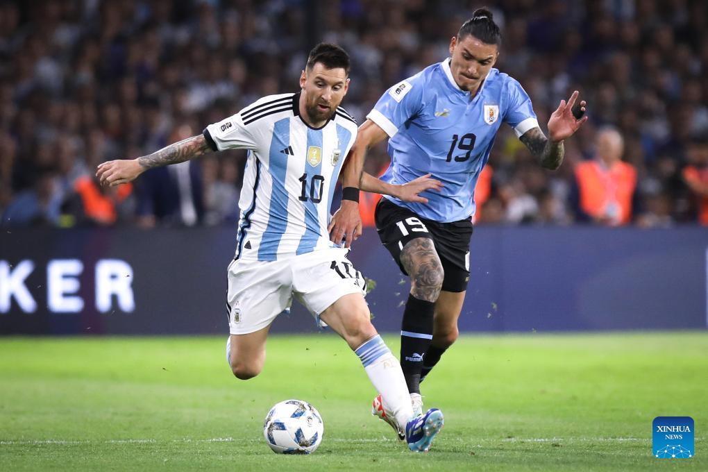 Lionel Messi (L) of Argentina vies with Darwin Nunes of Uruguay during the 2026 FIFA World Cup South American qualification football match between Argentina and Uruguay in Buenos Aires, Argentina, on Nov. 16, 2023. (Photo by Martin Sabala/Xinhua)