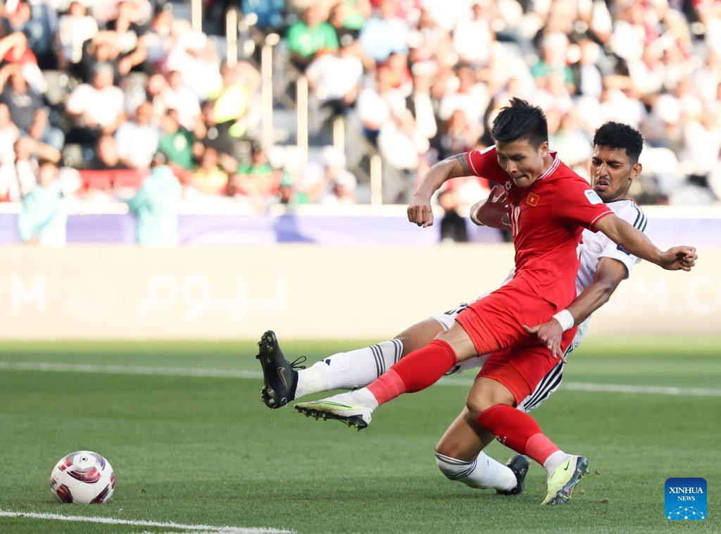 Nguyen Quang Hai (Front) of Vietnam shoot to score during the Group D match between Iraq and Vietnam at AFC Asian Cup Qatar 2023 at Jassim Bin Hamad Stadium in Doha, Qatar, Jan. 24 2024. (Xinhua/Jia Haocheng)
