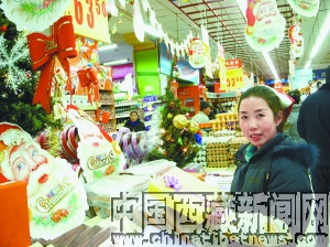 A customer wears a Christmas hat in a supermarket in Lhasa, capital city of Tibet on Dec. 20, 2009.[Photo: Tibet Business]