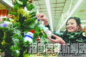 A customer watches the Christmas decorations in a supermarket in Lhasa, capital city of Tibet on Dec. 20 2009.[Photo: Tibet Business]