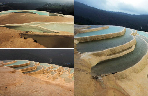 Baishui Terrace, or White Water Terrace is located at the foot of Haba Snow Mountain, about a hundred kilometers southeast of the village of Shangri-La. It is one of the biggest such terraces in China. The spring water rises from the mountain top and flows downward. [China.org.cn]