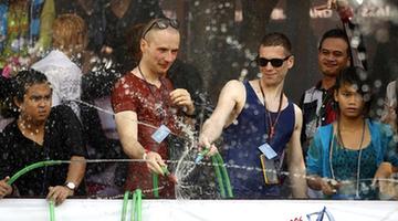 People celebrate the water festival on a street in Yangon, Myanmar, April 14, 2013. Myanmar's traditional Thingyan Water Festival kicked off in Yangon on Saturday morning with people, young and old, splashing water on each other. [Xinhua/U Aung]