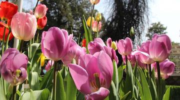 A child plays beside tulip flowers at the Zhongshan Park in Beijing, capital of China, April 16, 2013. [Xinhua/Wang Yueling]