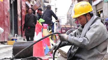 A worker cleans a drainage system in the old city of Lhasa, capital of southwest China's Tibet Autonomous Region, May 12, 2013. A project with an investment of 1.5 billion yuan to protect the old city of Lhasa started on December of 2012 and will be completed by the end of this June. (Xinhua/Liu Kun) |