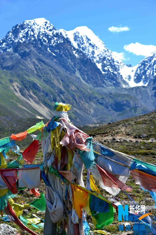 Under the snowy peaks are glorious wild flowers and flocks of cattle and sheep. (Xinhua/ Ling Feng)