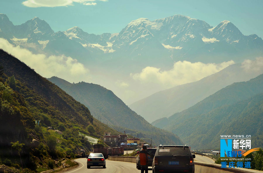 The snowy peak looks awesome and tantalizing through the window of the car. (Xinhua/ Ling Feng)