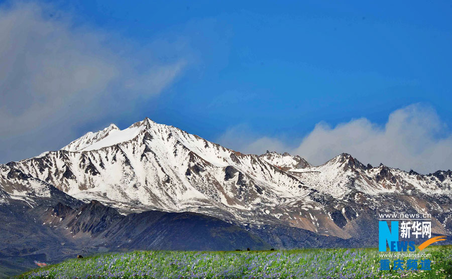 Under the snowy peaks are glorious wild flowers and flocks of cattle and sheep. (Xinhua/ Ling Feng)