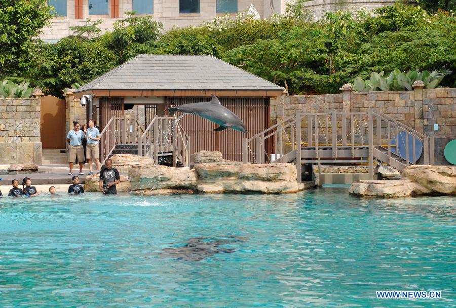 A dolphin leaps from the water at the Dolphin Island in Singapore's Resorts World Sentosa, Sept. 18, 2013. The Marine Life Park at Singapore's Resorts World Sentosa plans to launch its dolphin interaction programs on Sept. 30, the resorts said on Wednesday. (Xinhua/Chen Jipeng)
