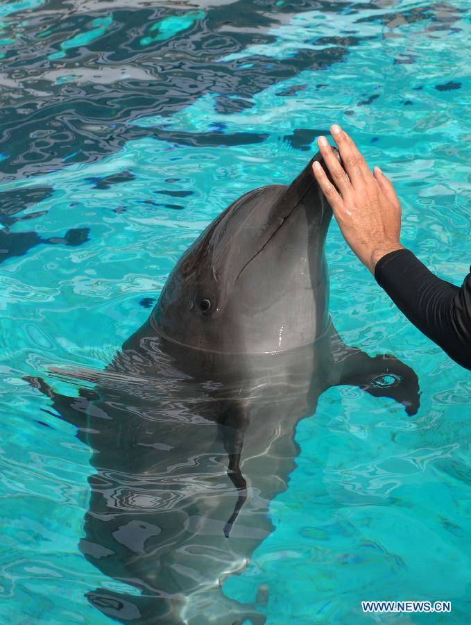 Photo taken on Sept. 18, 2013 shows a dolphin at the Dolphin Island in Singapore's Resorts World Sentosa. The Marine Life Park at Singapore's Resorts World Sentosa plans to launch its dolphin interaction programs on Sept. 30, the resorts said on Wednesday. (Xinhua/Chen Jipeng)