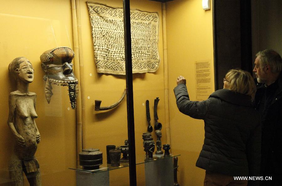Visitors view exhibits at the Royal Museum for Central Africa in Brussels, capital of Belgium, on Nov. 29, 2013. The Royal Museum for Central Africa, which was built in the early 20th century, was closed to be modernized on Dec. 1 over the next 3 years. (Xinhua/Wang Xiaojun)