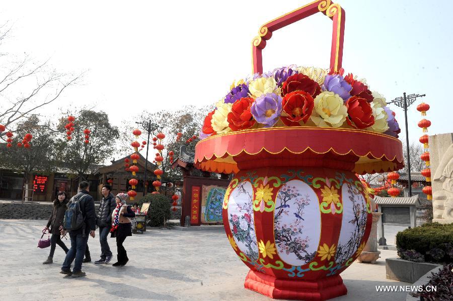 Citizens walk past a lantern decorated to greet the upcoming Spring Festival which falls on Jan. 31 this year, in Kaifeng, central China's Henan Province, Jan. 26, 2014. (Xinhua/Zhu Xiang)