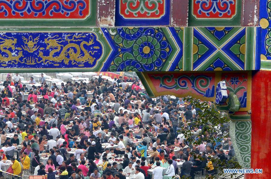 Tourists have a taste of local flavors at the Laojun Mountain Scenic Area in Luanchuan County, central China's Henan Province, Sept. 21, 2013. Henan received 410 million tourists in 2013, according to the data provided by Henan Provincial Tourism Administration. The tourism revenues in 2013 totaled 387.55 billion yuan (63.87 billion U.S. dollars), up 15.2 percent year on year. (Xinhua/Wang Song)