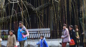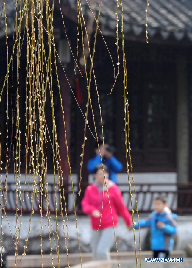 People visit the Zhuozheng Yuan Garden, a famous ancient garden in Suzhou, east China's Jiangsu Province, Feb. 22, 2014. Temperature in Suzhou rose on Saturday, with the blooming flowers attracting visitors. (Xinhua/Hang Xingwei)