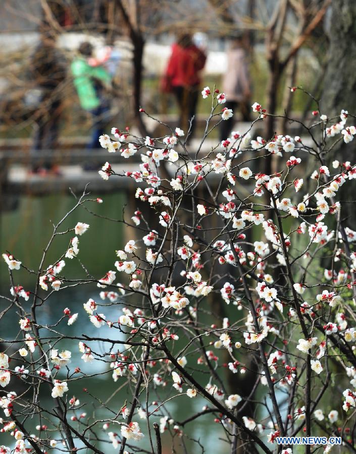 People visit the Zhuozheng Yuan Garden, a famous ancient garden in Suzhou, east China's Jiangsu Province, Feb. 22, 2014. Temperature in Suzhou rose on Saturday, with the blooming flowers attracting visitors. (Xinhua/Hang Xingwei)