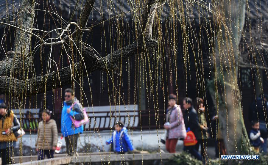 People visit the Zhuozheng Yuan Garden, a famous ancient garden in Suzhou, east China's Jiangsu Province, Feb. 22, 2014. Temperature in Suzhou rose on Saturday, with the blooming flowers attracting visitors. (Xinhua/Hang Xingwei)