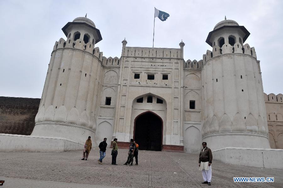 Tourists visit Lahore Fort or Shahi Qila (in Urdu) in eastern Pakistan's Lahore, Feb. 21, 2014. Lahore Fort, listed by United Nations Educational, Scientific and Cultural Organization (UNESCO) as a world heritage in 1981, contains marble palaces and mosques decorated with mosaics and gilt. (Xinhua/Jamil Ahmed)
