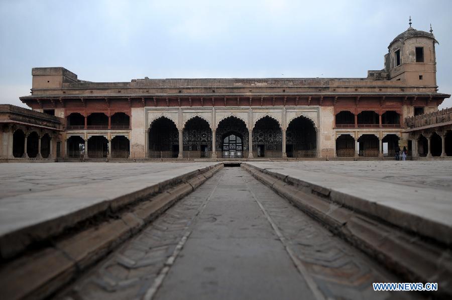 Photo taken on Feb. 21, 2014 shows a view of Lahore Fort or Shahi Qila (in Urdu) in eastern Pakistan's Lahore. Lahore Fort, listed by United Nations Educational, Scientific and Cultural Organization (UNESCO) as a world heritage in 1981, contains marble palaces and mosques decorated with mosaics and gilt. (Xinhua/Jamil Ahmed)