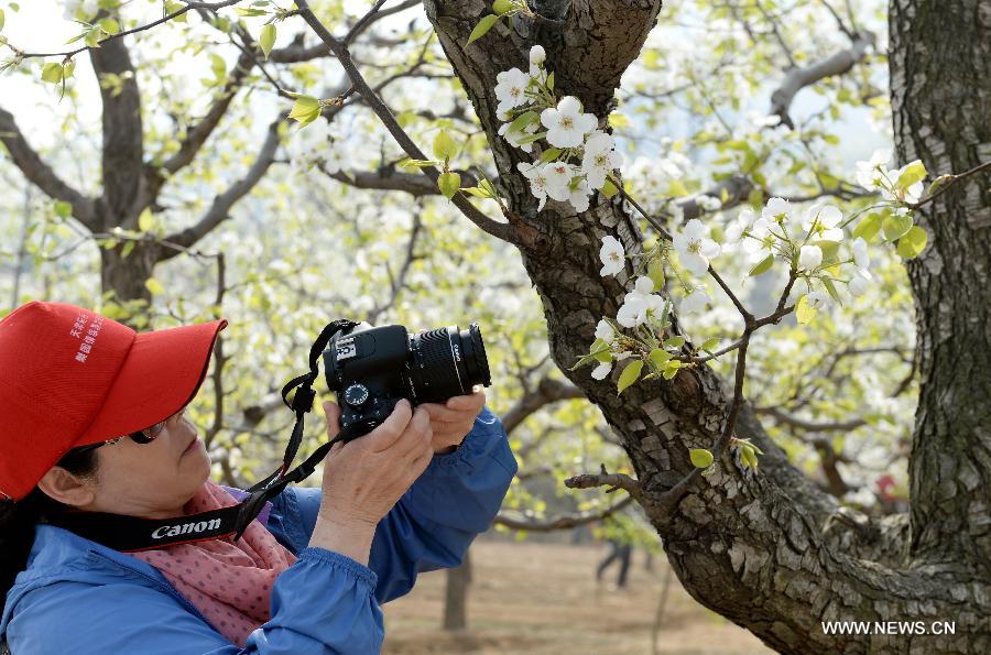 A tourist takes photos of pear blossoms during a pear park cultural festival at Jixian County, north China's Tianjin Municipality, April 9, 2014. The pear park cultural festival kicked off here Wednesday. (Xinhua/Wang Kun)