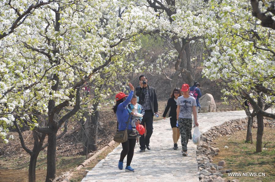 Tourists view pear blossoms during a pear park cultural festival at Jixian County, north China's Tianjin Municipality, April 9, 2014. The pear park cultural festival kicked off here Wednesday. (Xinhua/Wang Kun)
