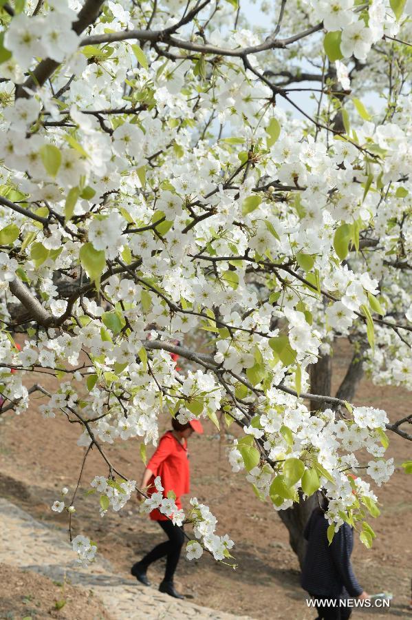 Tourists view pear blossoms during a pear park cultural festival at Jixian County, north China's Tianjin Municipality, April 9, 2014. The pear park cultural festival kicked off here Wednesday. (Xinhua/Wang Kun)