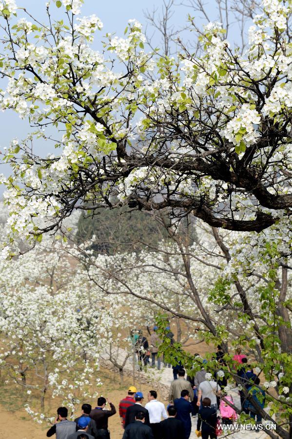 Tourists view pear blossoms during a pear park cultural festival at Jixian County, north China's Tianjin Municipality, April 9, 2014. The pear park cultural festival kicked off here Wednesday. (Xinhua/Wang Kun)