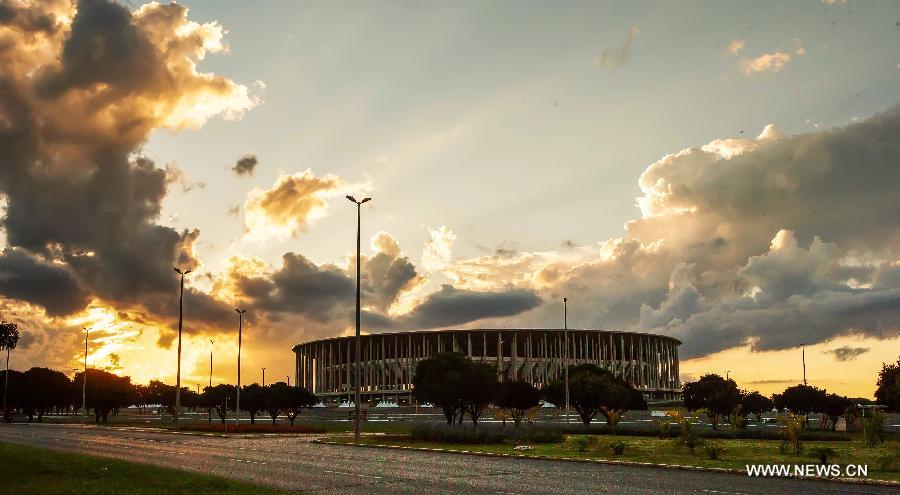 Photo taken on April 26, 2014 shows the cloud over the National Stadium before sunset in Brasilia, capital of Brazil. Seated on the Goias plateau, the city enjoys a ever-changing scenery of cloud. (Xinhua/Xu Zijian)
