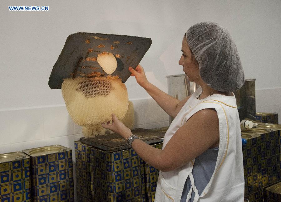 A woman shows how to make honey in Skopelos island of Greece, June 16, 2014. (Xinhua/Liu Yongqiu)