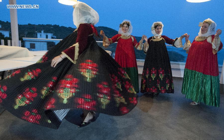 Dancers in traditional costumes perform in Skopelos island of Greece, June 16, 2014. (Xinhua/Liu Yongqiu)