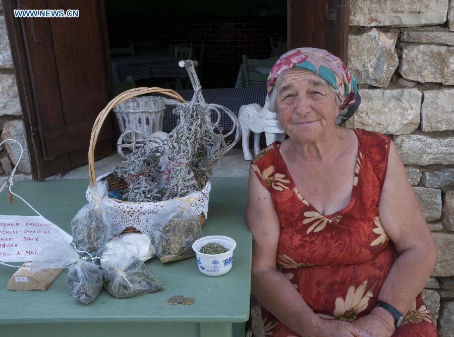 An old lady sells spices in Skopelos island of Greece, June 16, 2014. (Xinhua/Liu Yongqiu)